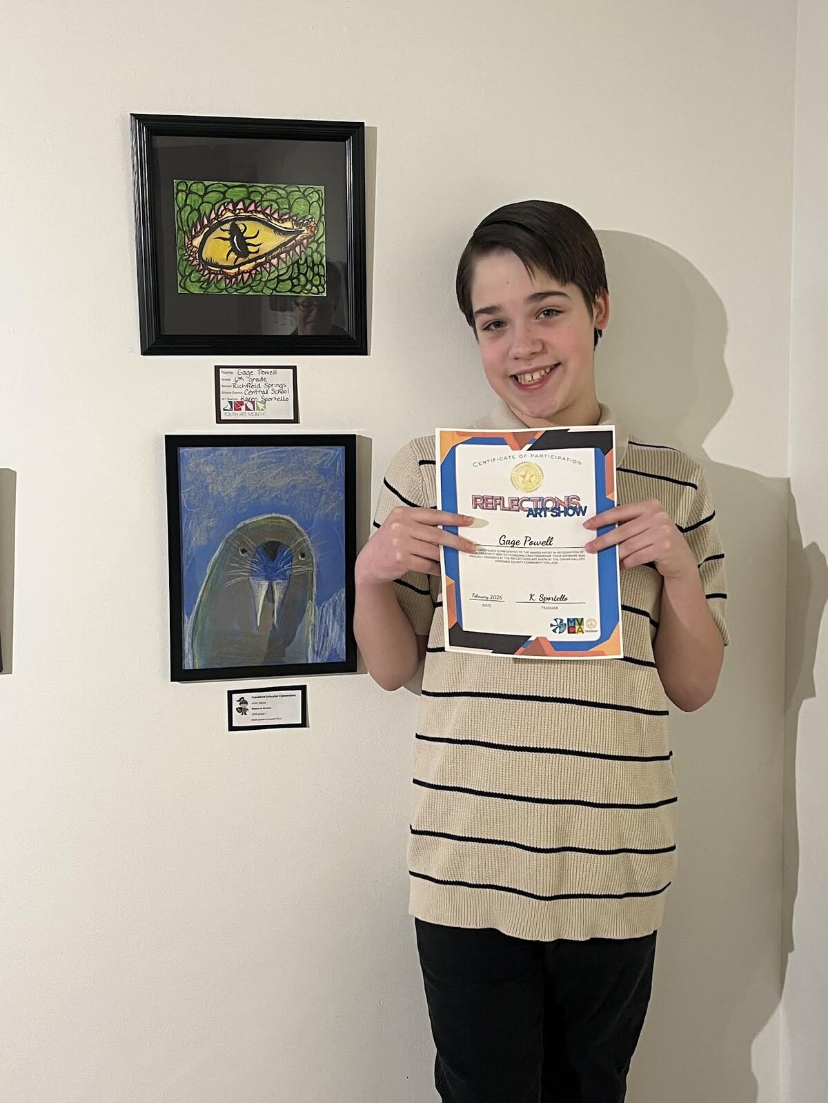 The opening of the 9th Annual Reflections Art Show was held on February 3rd. Celebrating Youth Art Month, this student art work will be on display at the Cogar Gallery at Herkimer College through the month of February. Congratulations to RSCS Art teachers, Karen Sportello and Dan Marrone, as well as the following chosen student artists: Camryn Bass, Gage Powell, Millie Franklin and Josslyn Cacilhas in the sixth grade and middle/high schoolers